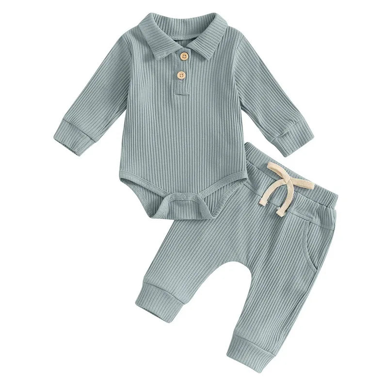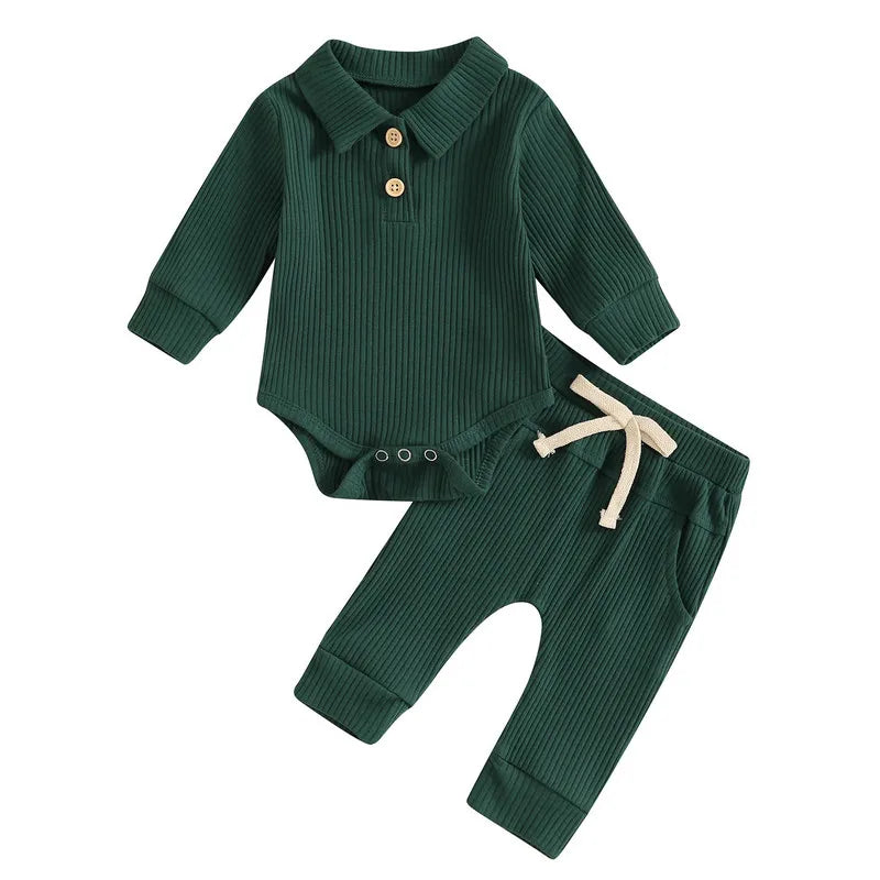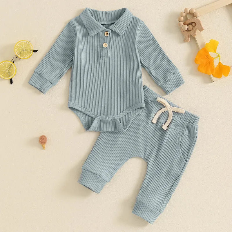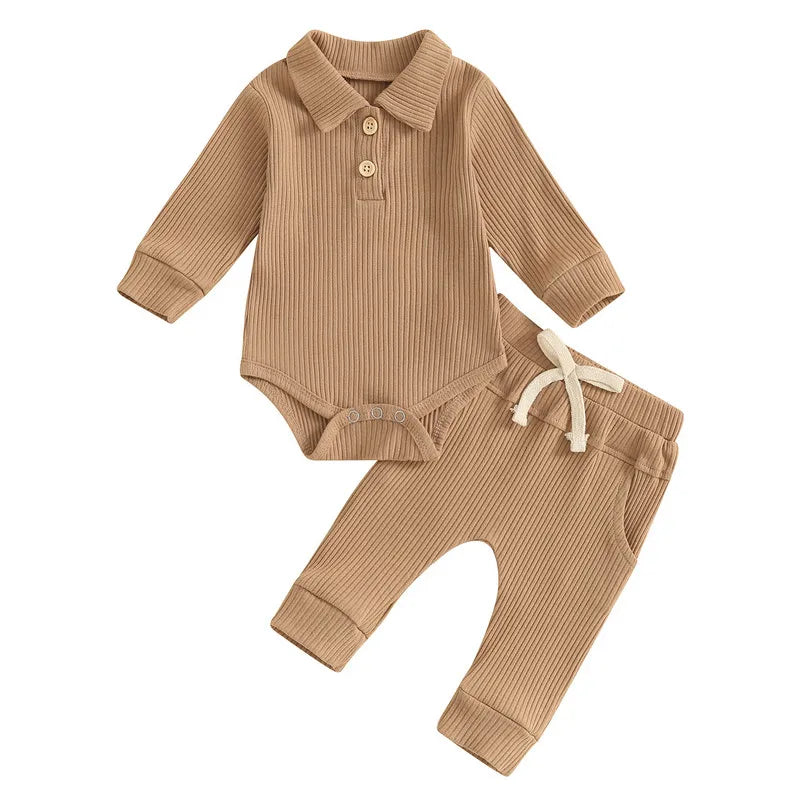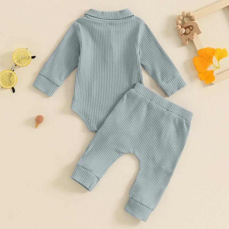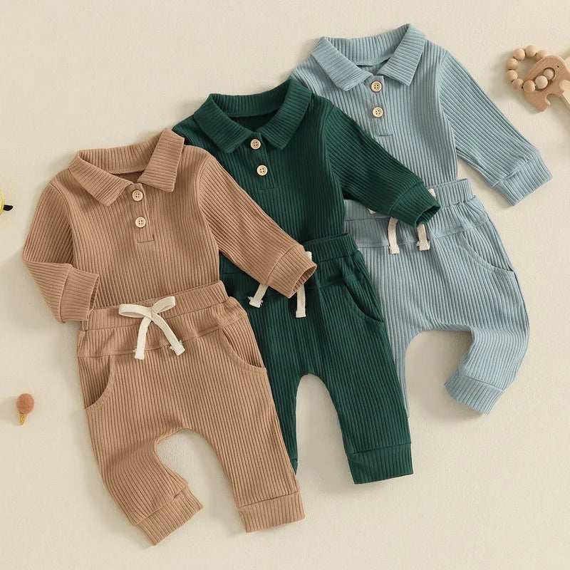 Dress your little one in comfort and style with this adorable 2-piece set! Featuring a ribbed long-sleeve lapel neck bodysuit with button details and matching drawstring pocket trousers, this outfit is perfect for babies 0-18 months. Soft, cozy, and fashionable—ideal for everyday wear, playdates, or special occasions!