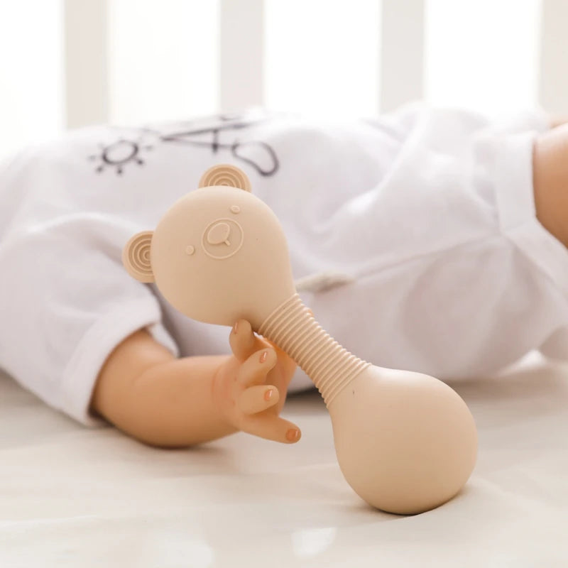 Shake, chew, and smile with the Bear Beat Teether Rattle! Designed as a cute cartoon bear maraca, this BPA-free silicone toy is perfect for babies 0–12 months. It soothes sore gums while making gentle sounds to keep your little one engaged. Safe, soft, and fun—it's a teether and sensory toy in one adorable package!