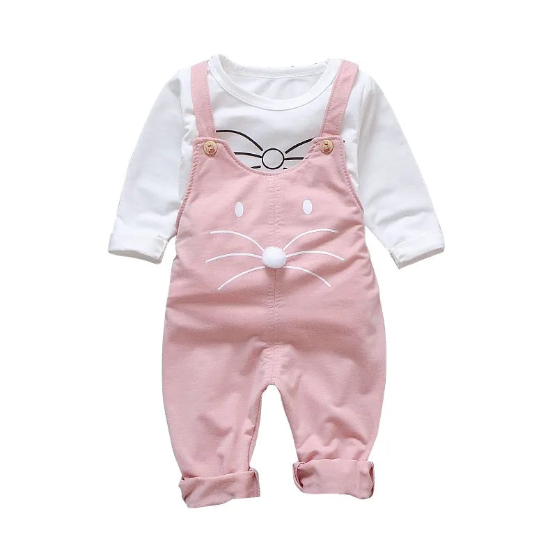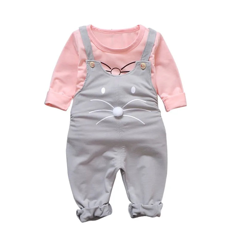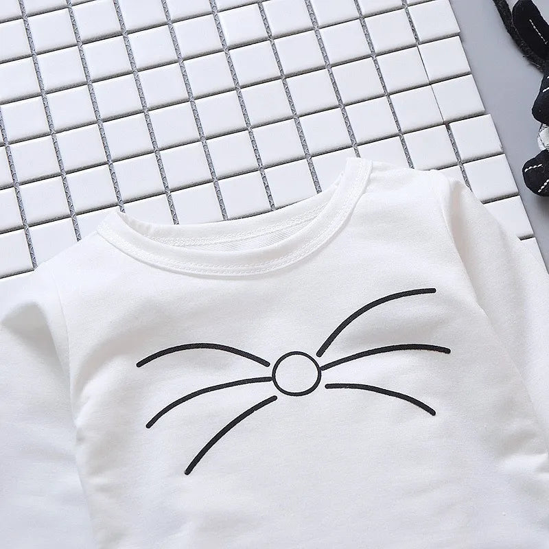 Dress your little one in this adorable 2-piece outfit featuring a soft long-sleeve top and cute strap trousers with a cat design! Perfect for spring and autumn, this stylish and comfy set is great for casual wear, playdates, and outings. A must-have for fashionable toddler girls!