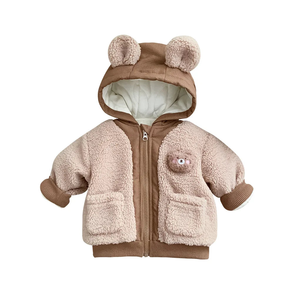 Keep your little one warm and stylish with this adorable bear plush hooded jacket! Made from soft cotton, this cozy overcoat features a cute bear design, convenient pockets, and a smooth zipper closure for easy wear. Perfect for chilly days, it provides warmth, comfort, and an irresistibly cute look for your baby. Ideal for everyday outings and special moments!